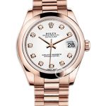 Basic Information: ID 178245 White Diamond Dial; Brand: Rolex; Series: Ladies’ Datejust; Movement Type: Automatic; Gender: Women’s; Movement Model: Cal. 2235; Movement Type: Automatic; Manufacturer: Rolex; Movement Diameter: 20mm; Movement Thickness: 5.95mm; Frequency: 28,800 vibrations per hour; Hairspring: Parachrom; Shock Absorber: Paraflex Jewel count: 31; Power reserve: 48 hours; Technical certification: Superlative Chronometer; Appearance: Case diameter: 31 mm; Case thickness: Not available; Dial color: White; Dial shape: Round; Strap color: Gold; Clasp type: Folding clasp, concealed folding crown buckle; Case back: Solid; Weight: Not available; Water resistance: 100 meters; Hour markers: Diamond-set; Clasp spacing: Not available; Lug spacing: Not available; Materials: Case material: 18k rose gold; Dial material: Diamond-set; Bezel material: 18k rose gold, domed outer ring; Crystal material: Scratch-resistant sapphire crystal, anti-reflective; Cyclops lens (2.5x magnification) for date window; Crown material: 18k rose gold; Strap material: 18k rose gold, President type, semi-circular three-link clasp material: 18k rose gold; Functions: Date display