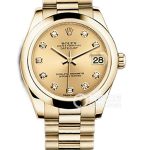 Basic Information: ID 178248; Champagne Dial with Diamonds; Brand: Rolex; Series: Ladies’ Datejust; Movement Type: Automatic; Gender: Women’s; Movement Model: Cal. 2235; Movement Type: Automatic; Manufacturer: Rolex; Movement Diameter: 20mm; Movement Thickness: 5.95mm; Frequency: 28,800 vibrations per hour; Hairspring: Parachrom; Shock Absorber: Paraflex Jewel count: 31; Power reserve: 48 hours; Technical certification: Superlative Chronometer; Appearance: Case diameter: 31 mm; Case thickness: Not available; Dial color: Champagne; Dial shape: Round; Strap color: Gold; Clasp type: Folding clasp, Oyster clasp with 5 mm Easylink extension system; Case back: Solid; Weight: Not available; Water resistance: 100 meters; Hour markers: Diamond-set; Clasp spacing: Not available; Lug spacing: Not available; Materials: Case material: 18k gold; Dial material: Diamond-set; Bezel material: 18k gold, domed outer ring; Crystal material: Scratch-resistant sapphire crystal, anti-reflective; Cyclops lens (2.5x) for date window; Crown material: 18k gold; Strap material: 18k gold, President type, semi-circular three-link clasp material: 18k gold; Functions: Date display