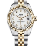 Basic Information: Model No. 178248; Gold Dial Commemorative Pattern Diamond-Set Oyster Strap; Brand: Rolex; Series: Ladies’ Datejust; Movement Type: Automatic; Gender: Women’s; Movement Model: Cal. 2235; Movement Type: Automatic; Manufacturer: Rolex; Movement Diameter: 20mm; Movement Thickness: 5.95mm; Frequency: 28,800 vibrations per hour; Hairspring: Parachrom; Shock-resistant: Paraflex Jewel count: 31; Power reserve: 48 hours; Case diameter: 31 mm; Case thickness: Not available; Dial color: Gold; Dial shape: Round; Strap color: Gold; Clasp type: Folding clasp, Oyster clasp, with 5 mm Easylink extension system; Case back: Not available; Weight: Not available; Water resistance: 100 meters; Hour marker type: Not available; Clasp spacing: Not available; Lug spacing: Not available; Materials: Case material: 18k gold, domed outer ring; Dial material: Champagne-colored commemorative pattern with diamonds; Bezel material: Not available; Crystal material: Scratch-resistant sapphire crystal glass, anti-reflective; Cyclops lens with 2.5x magnification (date window); Crown material: 18k gold; Strap material: 18k gold, Oyster, three-link clasp; Clasp material: 18k gold; Functions: Date display