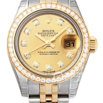 Basic Information: Model No. 178278, Gold Commemorative Dial, Oyster Strap, Brand: Rolex, Series: Ladies’ Datejust, Movement Type: Automatic, Gender: Women’s, Movement Model: Cal. 2235, Movement Type: Automatic, Manufacturer: Rolex, Movement Diameter: 20mm, Movement Thickness: 5.95mm, Frequency: 28,800 vibrations per hour, Hairspring: Parachrom, Shock-resistant: Paraflex Jewel count: 31; Power reserve: 48 hours; Technical certification: Superlative Chronometer; Appearance: Case diameter: 31 mm; Case thickness: Not available; Dial color: Gold; Dial shape: Round; Strap color: Gold; Clasp type: Folding clasp, Oyster clasp with 5 mm Easylink extension system; Case back: Solid; Weight: Not available; Water resistance: 100 meters; Hour markers: Diamond-set; Clasp spacing: Not available; Lug spacing: Not available; Materials: Case material: 18k gold; Dial material: Champagne-colored commemorative pattern with diamonds; Bezel material: 18k gold, fluted outer ring; Crystal material: Scratch-resistant sapphire crystal glass, anti-reflective; Cyclops lens with 2.5x magnification (date window); Crown material: 18k gold; Strap material: 18k gold, Oyster, three-link clasp; Clasp material: 18k gold; Functions: Date display