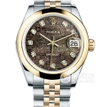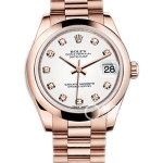Basic Information: Model No. 178278, Silver Dial, Oyster Strap, Brand: Rolex, Series: Ladies’ Datejust, Movement Type: Automatic, Gender: Women’s, Movement Model: Cal. 2235, Movement Type: Automatic, Manufacturer: Rolex, Movement Diameter: 20mm, Movement Thickness: 5.95mm, Frequency: 28,800 vibrations per hour, Hairspring: Parachrom, Shock-resistant: Paraflex Jewel count: 31; Power reserve: 48 hours; Technical certification: Superlative Chronometer; Appearance: Case diameter: 31 mm; Case thickness: Not available; Dial color: Silver; Dial shape: Round; Strap color: Gold; Clasp type: Folding clasp, concealed crown buckle; Case back: Solid; Weight: Not available; Water resistance: 100 meters; Hour markers: Diamond-set; Clasp spacing: Not available; Lug spacing: Not available; Materials: Case material: 18k gold; Dial material: Silver with diamonds; Bezel material: 18k gold, fluted outer ring; Crystal material: Scratch-resistant sapphire crystal, anti-reflective; Cyclops lens (2.5x magnification) for date window; Crown material: 18k gold; Strap material: 18k gold, Oyster, three-link clasp; Clasp material: 18k gold; Functions: Date display