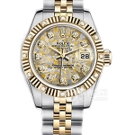 Basic Information Number 179173; Roman numeral hour markers; White mother-of-pearl dial; Brand: Rolex; Series: Ladies’ Datejust; Movement Type: Automatic; Gender: Women’s; Movement Model: Cal. 2235; Movement Type: Automatic; Manufacturer: Rolex; Movement Diameter: 20 mm; Movement Thickness: 5.95 mm; Frequency: 28,800 vibrations per hour; Hairspring: Parachrom; Shock-resistant: Paraflex Jewel count: 31; Power reserve: 48 hours; Technical certification: Superlative Chronometer certification; Appearance: Case diameter: 26mm; Case thickness: Not available; Dial color: White; Dial shape: Round; Strap color: Two-tone; Clasp type: Folding clasp; Oyster clasp with 5mm Easylink extension system; Case back: Not available; Weight: Not available; Water resistance: 100 meters; Hour markers: Roman numerals; Clasp spacing: Not available; Lug spacing: Not available; Materials: Case material: Stainless steel; Dial material: White mother-of-pearl; Bezel material: 18k gold; Crystal material: Sapphire crystal; Crown material: 18k gold; Strap material: 18k gold, stainless steel; Two-tone, Oyster, three-link clasp material: Stainless steel; Functions: Date display