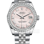 Basic Information: ID 179174; White Dial; Brand: Rolex; Series: Ladies’ Datejust; Movement Type: Automatic; Gender: Women’s; Movement Model: Cal. 2235; Movement Type: Automatic; Manufacturer: Rolex; Movement Diameter: 20mm; Movement Thickness: 5.95mm; Frequency: 28,800 vibrations per hour; Hairspring: Parachrom; Shock Absorber: Paraflex Jewel count: 31; Power reserve: 48 hours; Technical certification: Superlative Chronometer certification; Appearance: Case diameter: 26mm; Case thickness: Not available; Dial color: White; Dial shape: Round; Strap color: Silver; Clasp type: Folding clasp, concealed folding crown buckle; Case back: Solid; Weight: Not available; Water resistance: 100 meters; Hour markers: Roman numerals; Clasp spacing: Not available; Lug spacing: Not available; Materials: Case material: Stainless steel/18k white gold; Dial material: Not available; Bezel material: Stainless steel/18k white gold, fluted; Crystal material: Scratch-resistant sapphire crystal, anti-reflective; Cyclops lens with 2.5x magnification (date window); Crown material: Not available; Strap material: Stainless steel, Oyster, three-link; Clasp material: 904L stainless steel/18ct white gold, Oyster; Functions: Date display