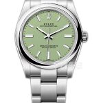 Basic Information Number 124200-0006 Brand Rolex Series Oyster Perpetual Movement Type Automatic Mechanical Gender Ladies Movement Model 2232 Movement Type Automatic Mechanical Manufacturer Rolex Frequency 28,800 vibrations per hour Number of jewels 31 Power Reserve 55 hours Technical Certification Superlative Chronometer Appearance Case Diameter: 34 mm Case Thickness: Not available Dial Color: Green Dial Shape: Round Bracelet Color: Silver Clasp Type: Folding Oysterclasp Case Back: Not available Weight: Not available Water Resistance: 100 meters Hour Marker Type: Bat hour markers Clasp Spacing: Not available Lug Spacing: Not available Materials Case Material Stainless Steel (Oystersteel) Dial Material Not available Bezel Material Oystersteel Crystal Material Sapphire Crystal Crown Material Oystersteel Bracelet Material Oystersteel Clasp Material Oystersteel Functions This watch has no other special functions.