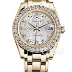 Basic Information Number 80285 – Mother-of-Pearl Brand: Rolex Series: PEARLMASTER Movement Type: Automatic Mechanical Gender: Women’s Movement Model: Cal. 2235 Movement Type: Automatic Mechanical Manufacturer: Rolex Movement Diameter: 20 mm Movement Thickness: 5.95 mm Frequency: 28,800 vibrations per hour Hairspring: Parachrom Shock-resistant Paraflex Jewel count: 31; Power reserve: 48 hours; Technical certification: Superlative Chronometer certification; Appearance: Case diameter: 29 mm; Case thickness: Not available; Dial color: White mother-of-pearl with diamonds; Dial shape: Round; Strap color: Gold; Clasp type: Concealed folding crown buckle; Case back: Not available; Weight: Not available; Water resistance: 100 meters; Hour markers: Roman numerals; Clasp spacing: Not available; Lug spacing: Not available; Materials: Case material: 18k rose gold; Dial material: Not available; Bezel material: 18k rose gold with diamonds; Crystal material: Scratch-resistant sapphire crystal with anti-reflective properties; Cyclops lens with 2.5x magnification for date window; Crown material: Screw-down, Twinlock waterproof system; Strap material: Diamond-set with pearls; Ladies’ style, five-link clasp; Clasp material: 18k rose gold; Functions: Date display.