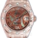 Basic Information Number 80298 Meteorite Brand Rolex Series PEARLMASTER Movement Type Automatic Mechanical Gender Women’s Movement Movement Model Cal. 2235 Movement Type Automatic Mechanical Manufacturer Rolex Movement Diameter 20mm Movement Thickness 5.95mm Frequency 28800 vibrations per hour Hairspring Parachrom Shock-resistant Paraflex Jewel count: 31; Power reserve: 48 hours; Technical certification: Superlative Chronometer certification; Appearance: Case diameter: 29 mm; Case thickness: Not available; Dial color: Meteorite; Dial shape: Round; Strap color: Gold; Clasp type: Folding clasp, concealed folding crown buckle; Case back: Not available; Weight: Not available; Water resistance: 100 meters; Hour markers: Diamond-set; Clasp spacing: Not available; Lug spacing: Not available; Materials: Case material: 18k gold; Dial material: Meteorite with diamonds; Bezel material: 18k gold with diamonds, outer ring set with diamonds; Crystal material: Scratch-resistant sapphire crystal glass, anti-reflective; Cyclops lens with 2.5x magnification (date window); Crown material: 18k gold; Strap material: 18k gold with diamonds and pearls; Ladies’ style, five-link chain; Clasp material: 18k gold; Functions: Date display