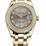 Basic Information: Model No. 80298; Mother-of-Pearl Dial with Emeralds; Brand: Rolex; Series: PEARLMASTER; Movement Type: Automatic; Gender: Ladies; Movement Model: Caliber 2235; Manufacturer: Rolex; Power Reserve: 48 hours; Technical Certification: Superlative Chronometer Certification; Appearance: Case Diameter: 29 mm; Case Thickness: Not Available; Dial Color: White; Dial Shape: Round; Strap Color: Gold; Clasp Type: Folding Clasp, Concealed Crown Buckle; Case Back: Not Available; Weight: Not Available; Water Resistance: 100 meters; Hour Markers: Diamond-set; Clasp Spacing: Not Available; Lug Spacing: Not Available; Materials: Case Material: 18k Gold; Dial Material: White Mother-of-Pearl with Emeralds; Bezel Material: 18k Gold with Diamonds, Outer Ring Set with Diamonds; Crystal Material: Scratch-resistant Sapphire Crystal, Anti-reflective; Cyclops Lens (2.5x) for Date Window; Crown Material: 18k Gold; Strap Material: 18k Gold, Pearl Lady Style, Five-Link Chain Clasp Material: 18k Gold; Functions: Date Display