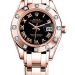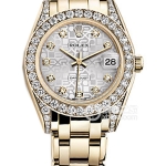 Basic Information: ID 80299 – Blue Dial; Brand: Rolex; Series: PEARLMASTER; Movement Type: Automatic; Gender: Women’s; Movement Model: Cal. 2235; Manufacturer: Rolex; Movement Diameter: 20mm; Movement Thickness: 5.95mm; Frequency: 28,800 vibrations per hour; Hairspring: Parachrom; Shock-resistant: Paraflex. Jewel count: 31; Power reserve: 48 hours; Technical certification: Superlative Chronometer; Appearance: Case diameter: 29 mm; Case thickness: Not available; Dial color: Blue; Dial shape: Round; Strap color: Silver; Clasp type: Folding clasp, concealed crown buckle; Case back: Not available; Weight: Not available; Water resistance: 100 meters; Hour marker type: Not available; Clasp spacing: Not available; Lug spacing: Not available; Materials: Case material: 18k white gold with diamonds; Dial material: Blue with diamonds; Bezel material: Not available; Crystal material: Scratch-resistant sapphire crystal glass, anti-reflective; Cyclops lens with 2.5x magnification; Date window; Crown material: Screw-down Twinlock double waterproof system; Strap material: 18k white gold, pearl-shaped, five-link bracelet; Clasp material: 18k white gold; Functions: Date display