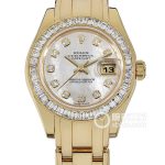 Basic Information Number 80308BR Brand Rolex Series PEARLMASTER Movement Type Automatic Mechanical Gender Ladies’ Movement Movement Model Cal. 2235 Movement Type Automatic Mechanical Manufacturer Rolex Movement Diameter 20mm Movement Thickness 5.95mm Frequency 28,800 vibrations per hour Hairspring Parachrom Shock-resistant Paraflex Jewels 31 Power Reserve 48 hours Technical Certifications Superlative Chronometer Certification Appearance Case Diameter: 29mm Case Thickness: 11mm Dial Color: White Dial Shape: Round Strap Color: Gold Clasp Type: Folding Clasp Case Back: Solid Case Back Weight: Not available Water Resistance: 100 meters Hour Markers Type: Diamond Hour Markers Clasp Spacing: Not available Lug Spacing: Not available Materials Case Material 18k Gold Dial Material White Mother-of-Pearl Bezel Material 18k Gold, Diamond-set Bezel Crystal Material Sapphire Crystal Crown Material 18k Gold Strap Material 18k Gold Clasp Material 18k Gold Functions Date Display
