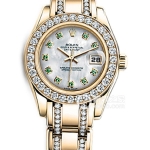 Basic Information: Item No. 80315; Black Pearl Lotus Pattern Dial; Brand: Rolex; Series: PEARLMASTER; Movement Type: Automatic; Gender: Women’s; Movement Model: Cal. 2235; Manufacturer: Rolex; Movement Diameter: 20mm; Movement Thickness: 5.95mm; Frequency: 28,800 vibrations per hour; Hairspring: Parachrom; Shock-resistant: Paraflex. Jewel count: 31; Power reserve: 48 hours; Technical certification: Superlative Chronometer; Appearance: Case diameter: 29 mm; Case thickness: Not available; Dial color: Rose gold, pearl black; Dial shape: Round; Strap color: Gold; Clasp type: Folding clasp, concealed folding crown buckle; Case back: Not available; Weight: Not available; Water resistance: 100 meters; Hour marker type: Not available; Clasp spacing: Not available; Lug spacing: Not available; Materials: Case material: 18k rose gold with diamonds, diamond-set outer ring; Dial material: Black mother-of-pearl with pink gold lotus pattern; Bezel material: Not available; Crystal material: Scratch-resistant sapphire crystal glass, anti-reflective; Cyclops lens with 2.5x magnification (date window); Crown material: 18k rose gold; Strap material: 18k rose gold, pearl-style, five-link arched chain; Clasp material: 18k rose gold; Functions: Date display.