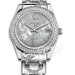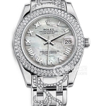 Basic Information: Watch ID 81159, Black Dial, Brand: Rolex, Series: PEARLMASTER, Movement Type: Automatic, Gender: Ladies, Movement Model: Cal. 2235, Manufacturer: Rolex, Movement Diameter: 20mm, Movement Thickness: 5.95mm, Frequency: 28,800 vibrations per hour, Hairspring: Parachrom, Shock-resistant: Paraflex Jewel count: 31; Power reserve: 48 hours; Technical certification: Superlative Chronometer certification; Appearance: Case diameter: 34mm; Case thickness: Not available; Dial color: Black; Dial shape: Round; Strap color: Silver; Clasp type: Concealed crown buckle; Case back: Solid; Weight: Not available; Water resistance: 100 meters; Hour markers: Roman numerals; Clasp spacing: Not available; Lug spacing: Not available; Materials: Case material: 18k white gold; Diamond-set dial material: Not available; Bezel material: Diamond-set; Crystal material: Scratch-resistant sapphire crystal glass, anti-reflective; Cyclops lens with magnifying date window; Crown material: Screw-down Twinlock double waterproof system; Strap material: 18k white gold, pearl-style, five-link circular clasp material: 18k white gold; Functions: Date display
