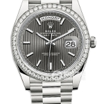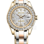 Basic Information Number 81159 – Diamond-set Dial Brand: Rolex Series: PEARLMASTER Movement Type: Automatic Mechanical Gender: Ladies’ Movement Movement Model: Cal. 2235 Movement Type: Automatic Mechanical Manufacturer: Rolex Movement Diameter: 20 mm Movement Thickness: 5.95 mm Frequency: 28,800 vibrations per hour Hairspring: Parachrom Shock-resistant Paraflex Jewel count: 31; Power reserve: 48 hours; Technical certification: Superlative Chronometer certification; Appearance: Case diameter: 34 mm; Case thickness: Not available; Dial color: Pavé diamond set; Dial shape: Round; Strap color: Silver; Clasp type: Concealed folding crown buckle; Case back: Solid; Weight: Not available; Water resistance: 100 meters; Hour markers: Roman numerals; Clasp spacing: Not available; Lug spacing: Not available; Materials: Case material: 18k white gold; Diamond-set dial material: Pavé diamond set; Dial with enamel numerals; Bezel material: Diamond-set; Crystal material: Scratch-resistant sapphire crystal glass, anti-reflective; Cyclops lens with magnifying date window; Crown material: Screw-down Twinlock double waterproof system; Strap material: 18k white gold, pearl-style, five-link circular clasp material: 18k white gold; Functions: Date display.
