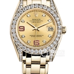 Basic Information: Model No. 81298; Gold-plated Mother-of-Pearl Iridescent Dial; Brand: Rolex; Series: PEARLMASTER; Movement Type: Automatic; Gender: Women’s; Movement Model: Cal. 2235; Movement Type: Automatic; Manufacturer: Rolex; Movement Diameter: 20mm; Movement Thickness: 5.95mm; Frequency: 28,800 vibrations per hour; Hairspring: Parachrom; Shock-resistant: Paraflex. Jewel count: 31; Power reserve: 48 hours; Technical certification: Superlative Chronometer; Appearance: Case diameter: 34 mm; Case thickness: Not available; Dial color: Golden crystal; Dial shape: Round; Strap color: Golden crystal, pearl-like, five-link chain; Clasp type: Folding clasp, concealed folding crown buckle; Case back: Solid; Weight: Not available; Water resistance: 100 meters; Hour marker type: Not available; Clasp spacing: Not available; Lug spacing: Not available; Materials: Case material: 18k gold; Diamond-set dial material: Not available; Bezel material: Not available; Crystal material: Scratch-resistant sapphire crystal, anti-reflective; Cyclops lens with magnifying date window; Crown material: 18k gold; Strap material: 18k gold; Clasp material: 18k gold; Functions: Date display