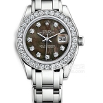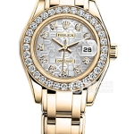 Basic Information: Model Number 81338, White Dial, Brand: Rolex, Series: PEARLMASTER, Movement Type: Automatic, Gender: Ladies, Movement Model: Cal. 2235, Manufacturer: Rolex, Movement Diameter: 20mm, Movement Thickness: 5.95mm, Frequency: 28,800 vibrations per hour, Hairspring: Parachrom, Shock-resistant: Paraflex Jewel count: 31; Power reserve: 48 hours; Technical certification: Superlative Chronometer certification; Appearance: Case diameter: 34 mm; Case thickness: Not available; Dial color: White; Dial shape: Round; Strap color: Gold; Clasp type: Folding clasp, concealed folding crown buckle; Case back: Not available; Weight: Not available; Water resistance: 100 meters; Hour markers: Roman numerals; Clasp spacing: Not available; Lug spacing: Not available; Materials: Case material: 18k gold; Dial material: Not available; Bezel material: 18k gold with diamonds, outer ring set with diamonds; Crystal material: Scratch-resistant sapphire crystal glass, anti-reflective; Cyclops lens with 2.5x magnification; Date window; Crown material: 18k gold, screw-down Twinlock double waterproof system; Strap material: 18k gold, pearl-shaped, five-link arched clasp; Clasp material: 18k gold; Functions: Date display.
