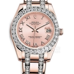 Basic Information Number 81339 White Mother-of-Pearl Brand Rolex Series PEARLMASTER Movement Type Automatic Gender Women’s Movement Movement Model Cal. 2235 Movement Type Automatic Manufacturer Rolex Movement Diameter 20mm Movement Thickness 5.95mm Frequency 28800 vibrations per hour Hairspring Parachrom Shock-resistant Paraflex Jewel count: 31; Power reserve: 48 hours; Technical certification: Superlative Chronometer certification; Appearance: Case diameter: 34 mm; Case thickness: Not available; Dial color: Silver-grey; Dial shape: Round; Strap color: Silver; Clasp type: Folding clasp, concealed folding crown buckle; Case back: Not available; Weight: Not available; Water resistance: 100 meters; Hour markers: Roman numerals; Clasp spacing: Not available; Lug spacing: Not available; Materials: Case material: 18k white gold; Dial material: White mother-of-pearl; Bezel material: 18k white gold with diamonds, outer ring set with diamonds; Crystal material: Scratch-resistant sapphire crystal glass, anti-reflective; Cyclops lens with 2.5x magnification (date window); Crown material: 18k white gold; Strap material: 18k white gold with diamonds and pearls; Lady style, vine pattern, five-link chain clasp material: 18k white gold; Functions: Date display.