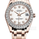 Basic Information Number: m80319-0044; Brand: Rolex; Series: PEARLMASTER; Movement Type: Automatic; Gender: Women’s; Movement Model: Cal. 2235; Movement Type: Automatic; Manufacturer: Rolex; Movement Diameter: 20 mm; Movement Thickness: 5.95 mm; Frequency: 28,800 vibrations per hour; Hairspring: Parachrom; Shock Absorber: Paraflex Jewel count: 31; Power reserve: 48 hours; Technical certification: Superlative Chronometer certification; Appearance: Case diameter: 29 mm; Case thickness: Not available; Dial color: Black; Dial shape: Round; Strap color: Silver; Clasp type: Concealed folding crown buckle; Case back: Not available; Weight: Not available; Water resistance: 100 meters; Hour markers: Diamond-set; Clasp spacing: Not available; Lug spacing: Not available; Materials: Case material: 18k white gold; Diamond-set dial: Mother-of-pearl with diamonds; Bezel material: Not available; Crystal material: Scratch-resistant sapphire crystal; Crown material: 18k white gold, screw-down double lock double water resistance system; Strap material: 18k white gold, pearl-shaped, five-link arched clasp material: 18k white gold; Functions: Date display