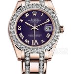 Basic Information Number: m81285-0046 Brand: Rolex Series: PEARLMASTER Movement Type: Automatic Mechanical Gender: Ladies’ Movement: Movement Model: 2236 Movement Type: Automatic Mechanical Manufacturer: Rolex Power Reserve: 55 hours Technical Certification: Superlative Chronometer Certification Appearance: Case Diameter: 34 mm Case Thickness: Not Available Dial Color: Purple Dial Shape: Round Strap Color: Gold Clasp Type: Folding Clasp, Concealed Crown Buckle Case Back: Solid Case Back Weight: Not Available Water Resistance: 100 meters Hour Markers: Roman Numerals/Diamond Set Clasp Spacing: Not Available Lug Spacing: Not Available Materials: Case Material: 18k Rose Gold Dial Material: Enlarged VI Roman Numerals with Diamonds Bezel Material: Diamond Set Crystal Material: Scratch-resistant Sapphire Crystal Glass, Anti-reflective Cyclops Window (2.5x) Date Window Crown Material: 18k Rose Gold Strap Material: 18k Rose Gold, Diamond and Pearl Set Ladies’ Style, Five-Link Clasp Material: 18k Rose Gold Functions: Date Display
