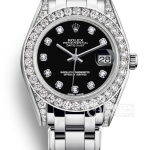 Basic Information Number: m81315-0005 Brand: Rolex Series: PEARLMASTER Movement Type: Automatic Gender: Women’s Movement Model: Cal.2235 Movement Type: Automatic Manufacturer: Rolex Movement Diameter: 20mm Movement Thickness: 5.95mm Frequency: 28,800 vibrations per hour Hairspring: Parachrom Shock Absorber: Paraflex Jewel count: 31; Power reserve: 48 hours; Technical certification: Superlative Chronometer certification; Appearance: Case diameter: 34 mm; Case thickness: Not available; Dial color: Black; Dial shape: Round; Strap color: Gold; Clasp type: Concealed folding crown buckle; Case back: Solid; Weight: Not available; Water resistance: 100 meters; Hour markers: Diamond-set; Clasp spacing: Not available; Lug spacing: Not available; Materials: Case material: 18k rose gold; Dial material: 18ct gold with diamond setting; Bezel material: 18k rose gold with diamond setting; Crystal material: Scratch-resistant sapphire crystal with Cyclops lens for magnification and date display; Crown material: Screw-down Twinlock double waterproof system; Strap material: 18k rose gold, Pearlmaster, five-link arched clasp; Clasp material: 18k rose gold; Functions: Date display