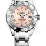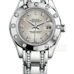 Basic Information Number: m80319-0083; Brand: Rolex; Series: PEARLMASTER; Movement Type: Automatic Mechanical; Gender: Women’s; Movement Model: Cal. 2235; Movement Type: Automatic Mechanical; Manufacturer: Rolex; Movement Diameter: 20 mm; Movement Thickness: 5.95 mm; Frequency: 28,800 vibrations per hour; Hairspring: Parachrom; Shock-resistant: Paraflex Jewel count: 31; Power reserve: 48 hours; Technical certification: Superlative Chronometer certification; Appearance: Case diameter: 29 mm; Case thickness: Not available; Dial color: Black; Dial shape: Round; Strap color: Silver; Clasp type: Concealed folding crown buckle; Case back: Not available; Weight: Not available; Water resistance: 100 meters; Hour markers: Diamond-set; Clasp spacing: Not available; Lug spacing: Not available; Materials: Case material: 18k white gold; Diamond-set dial material: Commemorative pattern with diamonds; Bezel material: Not available; Crystal material: Scratch-resistant sapphire crystal; Crown material: 18k white gold, screw-down double lock double water resistance system; Strap material: 18k white gold, pearl-shaped, five-link clasp material: 18k white gold; Functions: Date display