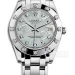 Basic Information Number: m86345sajor-0001; Brand: Rolex; Series: PEARLMASTER; Movement Type: Automatic Mechanical; Gender: Women’s; Movement Model: 3235 Movement Type: Automatic Mechanical; Manufacturer: Rolex; Frequency: 28,800 vibrations per hour; Hairspring: Paramagnetic; Blue Parachrom Hairspring; Shock Protection: High-performance Paraflex shock absorber; Jewels: 31; Power Reserve: 70 hours; Technical Certifications: Superlative Chronometer Certification; Appearance: Case Diameter: 39 mm; Case Thickness: Not available; Dial Color: Full Diamond; Dial Shape: Round; Strap Color: Gold; Clasp Type: Folding Clasp, Concealed Crown Buckle; Case Back: Not available; Weight: Not available; Water Resistance: 100 meters; Hour Markers: Roman numerals; Clasp Spacing: Not available; Lug Spacing: Not available; Materials: Case Material: 18k Rose Gold; Dial Material: Pavé-set with 713 Diamonds; Bezel Material: 18k Rose Gold, Outer Ring Set with 48 Orange-to-Yellow Square-Cut Sapphire Crystal Material: Scratch-resistant Sapphire Crystal, Anti-reflective; Cyclops Window with Magnifying Date Window; Crown Material: Screw-down Twinlock Double Water Resistance System; Strap Material: 18k Rose Gold, Diamond and Pearl Set; Ladies’ Style, Five-Link Loop Clasp Material: 18k Rose Gold; Functions: Date Display