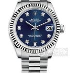 Basic Information Number: 178279-83169 Brand: Rolex Series: Women’s Datejust Movement Type: Automatic Gender: Women’s Movement Model: Cal. 2235 Movement Type: Automatic Manufacturer: Rolex Movement Diameter: 20mm Movement Thickness: 5.95mm Frequency: 28,800 vibrations per hour Hairspring: Parachrom Shock Absorber: Paraflex Jewel count: 31; Power reserve: 48 hours; Technical certifications: Superlative Chronometer certified; Appearance: Case diameter: 31 mm; Case thickness: Not available; Dial color: Blue; Dial shape: Round; Strap color: Silver; Clasp type: Folding clasp, concealed folding crown buckle; Case back: Solid; Weight: Not available; Water resistance: 100 meters; Hour markers: Diamond-set; Clasp spacing: Not available; Lug spacing: Not available; Materials: Case material: 18k white gold; Dial material: Diamond-set; Bezel material: 18k white gold, fluted outer ring; Crystal material: Scratch-resistant sapphire crystal, anti-reflective; Cyclops lens with 2.5x magnification (date window); Crown material: 18k white gold; Strap material: 18k white gold, President type, semi-circular three-link clasp material: 18k white gold; Functions: Date display