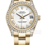 Basic Information Number: m178158-0092; Brand: Rolex; Series: Women’s Datejust; Movement Type: Automatic; Gender: Women’s; Movement Model: Cal. 2235; Movement Type: Automatic; Manufacturer: Rolex; Movement Diameter: 20 mm; Movement Thickness: 5.95 mm; Frequency: 28,800 vibrations per hour; Hairspring: Parachrom; Shock Absorber: Paraflex Jewel count: 31; Power reserve: 48 hours; Technical certification: Superlative Chronometer certification; Appearance: Case diameter: 31 mm; Case thickness: Not available; Dial color: Green; Dial shape: Round; Strap color: Gold; Clasp type: Folding clasp, concealed folding crown buckle; Case back: Not available; Weight: Not available; Water resistance: 100 meters; Hour marker type: Not available; Clasp spacing: Not available; Lug spacing: Not available; Materials: Case material: 18k gold with diamonds; Dial material: Olive green with diamonds, enlarged VI numerals with diamonds; Bezel material: Not available; Crystal material: Scratch-resistant sapphire crystal, anti-reflective; Cyclops lens with 2.5x magnification (date window); Crown material: 18k gold; Strap material: 18k gold, Oyster, three-link clasp; Clasp material: 18k gold; Functions: Date display