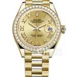 Basic Information Number: m279135rbr-0012 Brand: Rolex Series: Ladies’ Datejust Movement Type: Automatic Mechanical Gender: Ladies’ Movement: Movement Model: 2236 Movement Type: Automatic Mechanical Manufacturer: Rolex Power Reserve: 55 hours Technical Certification: Swiss Observatory Certification, Super Chronometer Appearance: Case Diameter: 28mm Case Thickness: Not Available Dial Color: Chocolate Dial Shape: Round Strap Color: Gold Clasp Type: Concealed Folding Crown Buckle Case Back: Solid Case Back, Rolex Fluted Screw-Down Case Back Weight: Not Available Water Resistance: 100 meters Hour Markers: Roman Numerals Clasp Spacing: Not Available Lug Spacing: Not Available Materials: Case Material: 18k Rose Gold Dial Material: Not Available Bezel Material: 18k Rose Gold Diamond Set Crystal Material: Scratch-resistant Sapphire Crystal, Double Anti-reflective Lens Cyclops Lens for Date Count Crown Material: Screw-down Twin Lock Double Water Resistant Crown Strap Material: 18k Rose Gold Clasp Material: 18k Rose Gold Functions: Date Display