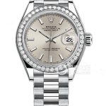 Basic Information Number: m279139rbr-0006; Brand: Rolex; Series: Women’s Datejust; Movement Type: Automatic Mechanical; Gender: Women’s; Movement Model: 2236 Movement Type: Automatic Mechanical; Manufacturer: Rolex; Power Reserve: 55 Hours; Technical Certification: Superlative Chronometer Certification; Appearance: Case Diameter: 28mm; Case Thickness: Not Available; Dial Color: Silver; Dial Shape: Round; Strap Color: Silver; Clasp Type: Concealed Folding Crown Buckle; Case Back: Screw-down Case Back; Weight: Not Available; Water Resistance: 100 Meters; Hour Markers: Bat-shaped; Luminous Count: Not Available; Clasp Spacing: Not Available; Lug Spacing: Not Available; Materials: Case Material: 18K White Gold; Dial Material: Easy-to-Learn Chromalight Long-Lasting Blue Luminous Display; Bezel Material: 18K White Gold, Outer Ring Set with 44 Round Diamonds; Crystal Material: Scratch-Resistant Sapphire Crystal, Cyclops Lens for Date Magnification; Crown Material: Screw-down, Twinlock Double Water Resistance System; Strap Material: 18K White Gold, President Type, Three-Linked Arched Clasp Material: 18K White Gold; Functions: Date Display