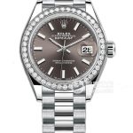 Basic Information Number: m279139rbr-0010 Brand: Rolex Series: Ladies’ Datejust Movement Type: Automatic Mechanical Gender: Ladies’ Movement: 2236 Movement Type: Automatic Mechanical Manufacturer: Rolex Power Reserve: 55 hours Technical Certification: Superlative Chronometer Certification Appearance: Case Diameter: 28 mm Case Thickness: Not Available Dial Color: Dark Grey Dial Shape: Round Strap Color: Silver Clasp Type: Concealed Folding Crown Buckle Case Back: Screw-down Case Back Weight: Not Available Water Resistance: 100 meters Hour Markers: Roman Numerals Clasp Spacing: Not Available Lug Spacing: Not Available Materials: Case Material: 18K White Gold Dial Material: Not Available Bezel Material: 18K White Gold, with 44 round diamonds on the outer ring Crystal Material: Scratch-resistant sapphire crystal, Cyclops lens for magnification Date Crown Material: Screw-down, Twinlock double waterproof system Strap Material: 18K White Gold, President type, three-link clasp Material: 18K White Gold Functions: Date Display