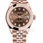 Basic Information Number: m279165-0016 Brand: Rolex Series: Ladies’ Datejust Movement Type: Automatic Gender: Women’s Movement Model: 2236 Movement Type: Automatic Manufacturer: Rolex Power Reserve: 55 hours Technical Certification: Swiss Observatory Certification, Super Chronometer Appearance: Case Diameter: 28mm Case Thickness: Not available Dial Color: Chocolate with diamonds Dial Shape: Round Strap Color: Gold Clasp Type: Concealed folding crown clasp Case Back: Solid Weight: Not available Water Resistance: 100 meters Hour Markers: Diamond-set Hour Markers Clasp Spacing: Not available Lug Spacing: Not available Materials: Case Material: 18k rose gold Dial Material: Not available Bezel Material: 18k rose gold Crystal Material: Sapphire Crystal Crown Material: 18k rose gold Strap Material: 18k rose gold, Jubilee, five-link clasp Material: 18k rose gold Functions: Date Display