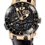 Basic Information Number 326-03 Brand: Ulysse Nardin Series: Complicated Functions Movement Type: Automatic Mechanical Gender: Men’s Movement: Movement Model: UN-32 Movement Type: Automatic Mechanical Manufacturer: Ulysse Nardin Appearance: Case Diameter: 43mm Case Thickness: Not Available Dial Color: Black Dial Shape: Round Strap Color: Black Clasp Type: Folding Clasp Case Back: Transparent Weight: Not Available Water Resistance: 100 meters Hour Marker Type: Other Hour Markers Clasp Spacing: Not Available Lug Spacing: Not Available Materials: Case Material: 18k Rose Gold, 950 Platinum Dial Material: Not Available Bezel Material: Not Available Crystal Material: Sapphire Crystal Crown Material: Not Available Strap Material: Rubber, Alligator Leather Clasp Material: Titanium, Ceramic Function: Perpetual Calendar
