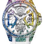Basic Information: Model Number 1720-400B1LE-9A-RAIN/3A; Brand: Ulysse Nardin; Series: BLAST; Movement Type: Automatic Mechanical; Gender: Men’s; Official Warranty: 5 Years; Limited Edition: 8; Movement Model: UN-172; Movement Type: Automatic Mechanical; Manufacturer: Ulysse Nardin; Frequency: 18,800 vibrations per hour; Number of Jewels: 25; Number of Parts: 137; Power Reserve: 72 hours; Appearance: Case Diameter: 45 mm; Case Thickness: 13.35 mm; Dial Color: Skeletonized; Dial Shape: Skeletonized; Strap Color: White; Clasp Type: Folding Clasp; Case Back: Transparent; Weight: Not Available; Water Resistance: 50 meters; Hour Markers: Sapphire Crystal; Hour Marker Spacing: Not Available; Lug Spacing: Not Available; Material: Case Material: White gold case (total weight 5.82 carats) decorated with 77 sapphires; Dial Material: Dial decorated with 48 sapphires (total weight 2.46 carats); Bezel Material: White gold bezel decorated with 64 sapphires (total weight 3.92 carats). Crystal: Sapphire crystal glass; Crown: White gold crown adorned with 8 sapphires (total weight 0.2 carats); Strap: Rubber; Buckle: White gold set with 14 sapphires (total weight 0.93 carats); Functions: Tourbillon.