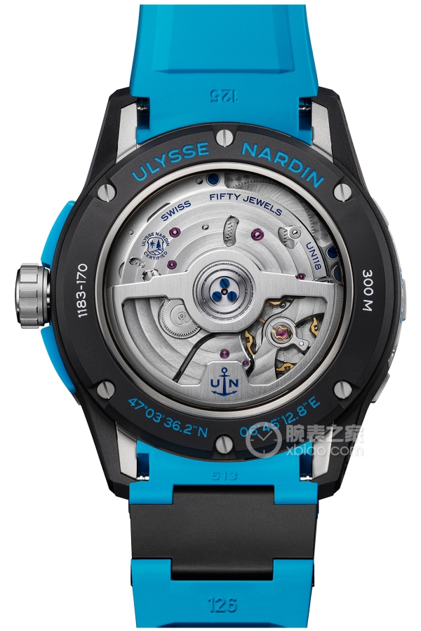 Basic Information Number: 1183-170-2B/3A Brand: Ulysse Nardin Series: Diving Movement Type: Automatic Mechanical Gender: Men’s Movement Model: UN-118 Movement Type: Automatic Mechanical; Manufacturer: Ulysse Nardin; Power Reserve: 60 hours; Dimensions: Case Diameter: 44mm; Case Thickness: 14.81mm; Dial Color: Black; Dial Shape: Round; Strap Color: Deep Blue; Buckle Type: Pin Buckle; Case Back: Transparent; Weight: Not Available; Water Resistance: 300 meters; Hour Markers: Bat; Luminous Count: Not Available; Clasp Spacing: Not Available; Lug Spacing: Not Available; Materials: Case Material: Stainless Steel, with recycled stainless steel on the sides and back; Dial Material: Black sandblasted dial decorated with an embossed and satin-brushed “X” logo, power reserve indicator at 12 o’clock, date window and small seconds sub-dial at 6 o’clock, hour markers and hands coated with Super-LumiNova; Bezel Material: Recycled Carbon®; Unidirectional Rotating Concave Bezel; Crystal Material: Domed Sapphire Crystal; Crown Material: Stainless Steel; Strap Material: Rubber, with black ceramic logo at 6 o’clock; Details: Buckle Material: Black Ceramic; Functions: Date Display, Power Reserve Display