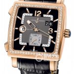 Basic Information Number 246-92B/692 Brand: Ulysse Nardin Series: Dual Time Zone Movement Type: Automatic Mechanical Gender: Men’s Movement: UN-24 Movement Type: Automatic Mechanical Manufacturer: Ulysse Nardin Appearance Case Diameter: 42mm Case Thickness: Not Available Dial Color: Black Dial Shape: Square Strap Color: Black Clasp Type: Folding Clasp Case Back: Not Available Weight: Not Available Water Resistance: 50 meters Hour Marker Type: Bat Hour Markers Clasp Spacing: Not Available Lug Spacing: Not Available Materials Case Material: 18k Rose Gold Dial Material: Not Available Bezel Material: 18k Rose Gold with 1.58 Carat Diamonds Crystal Material: Sapphire Crystal Glass Crown Material: Not Available Strap Material: Genuine Leather Clasp Material: 18k Rose Gold Functions: Date Display, Big Date, Dual Time Zone