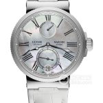 Basic Information Number 1183-160/40 Brand: Ulysse Nardin Series: Marine Movement Type: Automatic Mechanical Gender: Ladies’ Movement: UN-118 Movement Type: Automatic Mechanical Manufacturer: Ulysse Nardin Power Reserve: 60 hours Technical Certification: Swiss Official Chronometer Testing Institute (COSC) Appearance: Case Diameter: 39 mm Case Thickness: Not Available Dial Color: White Dial Shape: Round Strap Color: White Clasp Type: Folding Clasp Case Back: Transparent Weight: Not Available Water Resistance: 100 meters Hour Markers: Roman Numerals Clasp Spacing: Not Available Lug Spacing: Not Available Materials: Case Material: Stainless Steel Dial Material: Mother-of-Pearl Bezel Material: Stainless Steel Crystal Material: Sapphire Crystal Crown Material: Screw-down Crown Strap Material: Alligator Leather Clasp Material: Stainless Steel Functions: Date Display, Chronograph