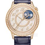 Basic Information Number: 8006F/000R-B976 Brand: Vacheron Constantin Series: Elegance Movement Type: Automatic Mechanical Gender: Ladies’ Movement: Movement Model: 1088 L Movement Type: Automatic Mechanical Manufacturer: Vacheron Constantin Movement Thickness: 5.03 mm Frequency: 28,800 vibrations per hour Jewels: 26 Number of Parts: 164 Power Reserve: 40 hours Case Diameter: 37 mm Case Thickness: 10.53 mm Dial Color: White Dial Shape: Round Strap Color: Blue Buckle Type: Pin Buckle Case Back: Not Available Weight: 73 grams Water Resistance: 30 meters Hour Markers: Arabic numerals Clasp Spacing: Not Available Lug Spacing: 18/16 Materials Case Material: Pink gold with diamonds Dial Material: 18K white gold with diamonds Bezel Material: Pink gold with diamonds Crystal Material: Sapphire crystal Crown Material: Pink gold with diamonds Strap Material: Mississippi alligator leather/satin buckle Material: Pink gold Functions: Moon phase