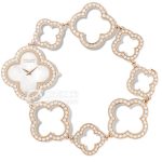 Basic Information ID: VCARN5KC00 Brand: Van Cleef & Arpels Series: ALHAMBRA Movement Type: Quartz Gender: Ladies Movement Type: Quartz Case Diameter: 27×27 mm Case Thickness: 5.65 mm Dial Color: White Dial Shape: Other Strap Color: Gold Clasp Type: Buckle Case Back: Solid Weight: Not available Water Resistance: 30 meters Hour Marker Type: None Hour Marker Spacing: Not available Lug Spacing: Not available Materials: Case Material: Rose Gold with Diamonds Dial Material: Mother-of-Pearl Bezel Material: Rose Gold with Diamonds Crystal Material: Sapphire Crystal Crown Material: Rose Gold Strap Material: Rose Gold with Diamonds Clasp Material: Rose Gold Functions: This watch has no other special functions.