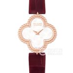Basic Information ID: VCARO8WS00 Brand: Van Cleef & Arpels Series: ALHAMBRA Movement Type: Quartz Gender: Ladies Movement Type: Quartz Case Diameter: 22.7 x 22.7 mm Case Thickness: Not Available Dial Color: White Dial Shape: Other Strap Color: Glossy Deep Burgundy Red Clasp Type: Pin Buckle (with one interchangeable pin buckle) Case Back: Not Available Weight: Not Available Water Resistance: 30 meters Hour Markers: None Hour Marker Spacing: Not Available Lug Spacing: Not Available Materials: Case Material: 18k Rose Gold Dial Material: Mother-of-Pearl Bezel Material: 18k Rose Gold Crystal Material: Sapphire Crystal Crown Material: 18k Rose Gold Strap Material: Alligator Leather (with two interchangeable straps) Clasp Material: 18k Rose Gold Functions: This watch has no other special functions.
