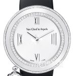 Basic Information ID: VCARM95500 Brand: Van Cleef & Arpels Series: CHARMS Movement Type: Quartz Gender: Ladies Movement Type: Quartz Case Diameter: 38mm Case Thickness: Not Available Dial Color: White Dial Shape: Round Strap Color: Black Clasp Type: Pin Buckle Case Back: Solid Weight: Not Available Water Resistance: 30 meters Hour Markers: Roman Numerals Clasp Spacing: Not Available Lug Spacing: Not Available Materials: Case Material: 18k white gold with diamonds Dial Material: Not Available Bezel Material: 18k white gold with diamonds Crystal Material: Sapphire Crystal Crown Material: 18k white gold with round diamonds Strap Material: Satin Clasp Material: 18k white gold Functions: This watch has no other special functions.