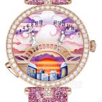 Basic Information Number: VCARPES600 Brand: Van Cleef & Arpels Series: Poetic Complications Movement Type: Automatic Mechanical Gender: Unisex Movement Type: Automatic Mechanical Power Reserve: 36 hours Appearance: Case Diameter: 38 mm Case Thickness: Not Available Dial Color: Patterned Dial Shape: Round Strap Color: Pink Clasp Type: Pin Buckle Case Back: Solid Case Back Weight: Not Available Water Resistance: 30 meters Hour Marker Type: Arabic Numerals Clasp Spacing: Not Available Lug Spacing: Not Available Materials: Case Material: Rose Gold with Diamonds Dial Material: Rhodium, White Gold, Yellow Gold, Rose Gold, Enamel Bezel Material: Rose Gold with Diamonds Crystal Material: Sapphire Crystal Glass Crown Material: Rose Gold with Diamonds Strap Material: Rose Gold with Diamonds Clasp Material: 18k Rose Gold Functions: Flyback/Retrograde
